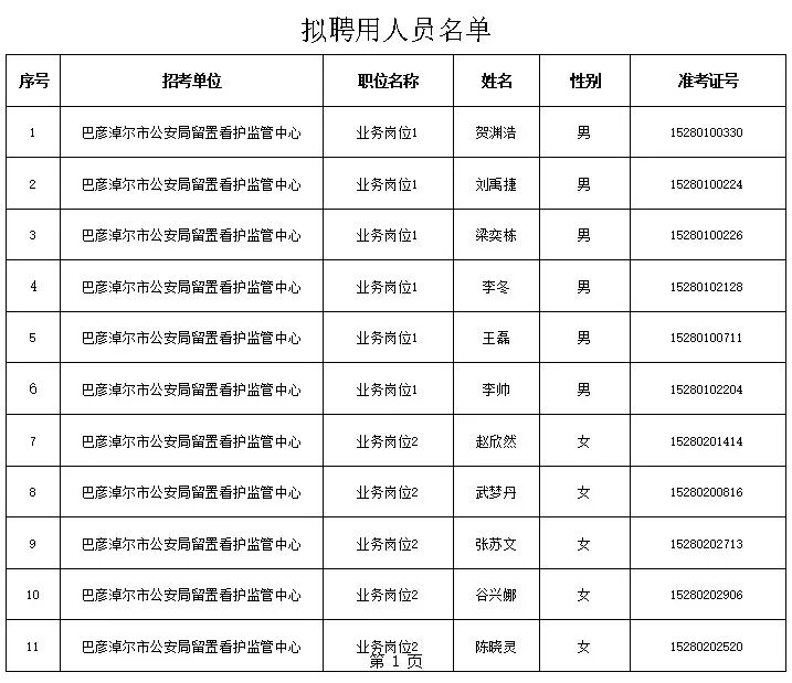 按照《巴彦淖尔市公安局2025年面向社会公开招聘警务辅助人员简章》要求,经体检、考察程序,现对巴彦淖尔市公安局留置看护监管中心拟聘用人员(第一批次递补)名单予以公示。