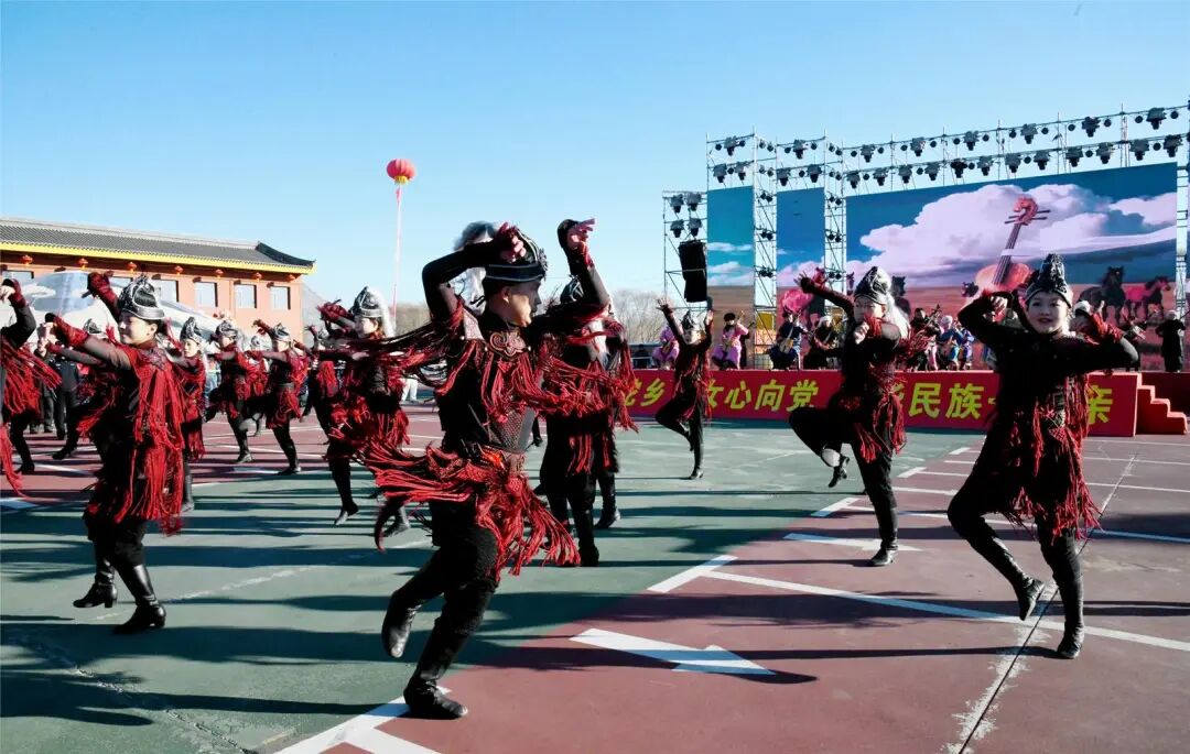 9时30分,激昂的旋律响彻广场,威风凛凛的越野车队、步伐沉稳的红驼队列、精神抖擞的骏马方阵依次缓缓前行,身着绚丽民族服饰的各族群众,笑容里盛满新年的喜悦,现场观众传来阵阵欢呼。百人马头琴合奏《盛世欢歌赞吉祥》气势恢宏,乌兰牧骑演员身着盛装,以《驼峰上的角逐》《烈焰红驼》等歌舞展现了草原儿女的豪迈和广大群众安居乐业的美好愿望。